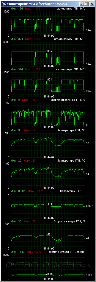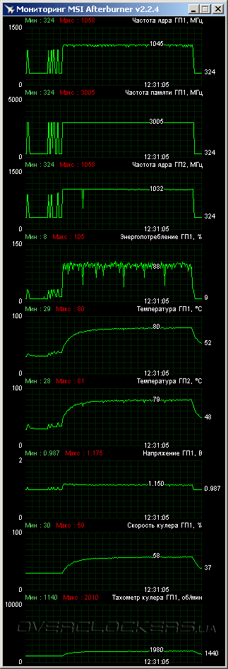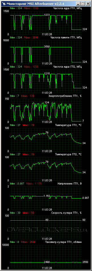 Для такого разгона пришлось улучшать охлаждение. Скорость вентилятора мы зафиксировали на 80% (примерно 2500 об/мин). Шум при этом был уже высокий. Характеристики тестируемых видеокарт