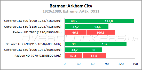 В игре Alan Wake у видеокарт AMD очень сильные позиции. Во многом это связано и с чувствительностью приложения к пропускной способности памяти. Поэтому обычный GeForce GTX 680 даже при разгоне слабее Radeon HD 7970 на заводских частотах. GeForce GTX 690 быстрее GeForce GTX 680 на 96% по минимальному fps и на 86% по среднему fps. Разгон дает прирост в 19% и 8%.