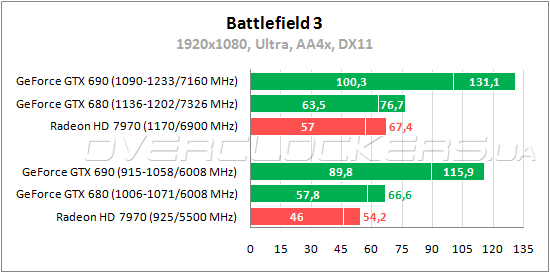 В популярном шутере Battlefield 3 флагман GeForce GTX 690 лучше GeForce GTX 680 на 55% по минимальному fps и на 74% по средней частоте кадров. Radeon HD 7970 слабее в два раза. Даже при максимальном разгоне Radeon уступает 58/72% двухпроцессорному GeForce на заводских частотах. Разгон позволяет поднять результаты на 11—13%.