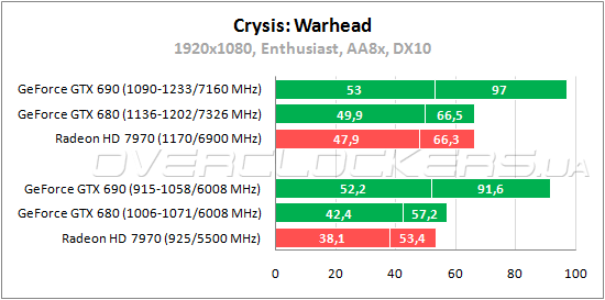 В Warhead сразу бросается в глаза минимальный прирост от разгона. Тут производительность явно ограничивается потенциалом процессора. В номинале разница с GeForce GTX 680 достигает 60% по средней частоте кадров.