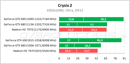 Еще один сюрприз нас ожидал в Crysis 2. Даже в этой ресурсоемкой игре ограничителем производительности выступил процессор. При разгоне GPU у GeForce GTX 690 на 17% и памяти на 19% мы получаем прирост по средней частоте лишь 3,7%! Хотя по минимальному параметру рост внушительный. Но в этом тесте разгон видеокарт часто дает больший прирост по минимальному fps, чем прирост по частотам. Даже с ограничениями по причине недостаточной мощности CPU у двухпроцессорного флагмана внушительное преимущество над одночиповыми моделями.