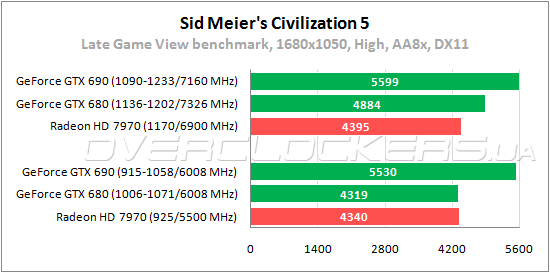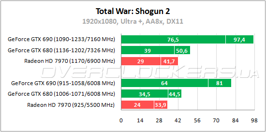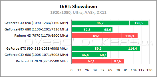 Игра Showdown жестко оптимизирована под решения AMD. Но это не помешало и тут GeForce GTX 690 обогнать Radeon HD 7970. Обращает на себя внимание внушительная разница 90—92% с GeForce GTX 680. Разгон дает дополнительные 8—12%. Скорее всего с более мощным процессором прирост производительности при повышении частот был бы еще больше.