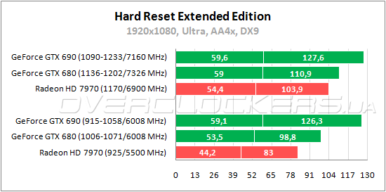 В Hard Reset результаты тоже уперлись в процессор. Из-за этого прирост от разгона мизерный. Так что озвучивать какие-то конкретные цифры при сравнении с однопроцессорными видеокартами не имеет смысла. Можно лишь сказать, что даже при разгоне они не в состоянии приблизиться к результатам GeForce GTX 690 на заводских частотах.