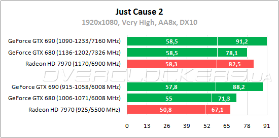 Уверенное лидерство GeForce GTX 690 в Just Cause 2 и снова небольшая разница между участниками из-за недостаточной мощности процессора Core i7.