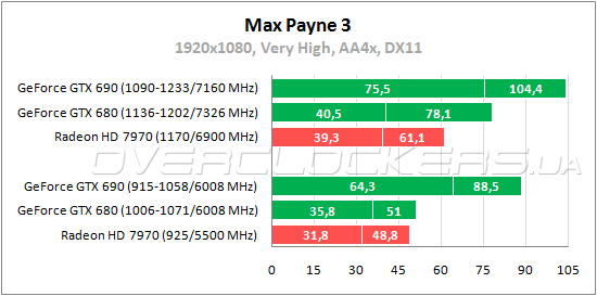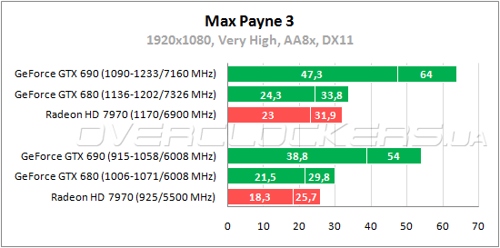 В обоих тестовых режимах Max Payne 3 двухчиповый GeForce GTX 690 обеспечивает максимальный комфорт при отрыве в 80% от GeForce GTX 680. В самом тяжелом режиме у Radeon HD 7970 более чем двукратное отставание от лидера.
