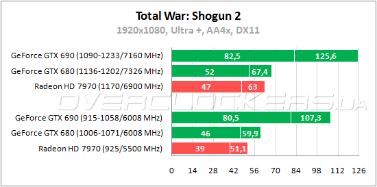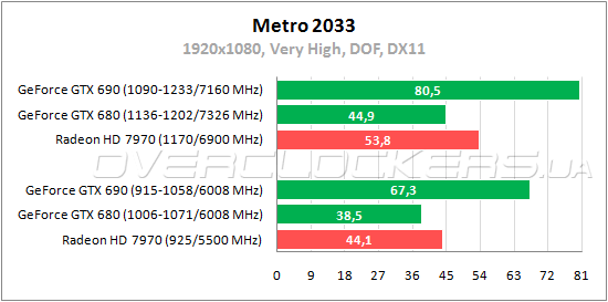 В Metro 2033 преимущество GeForce GTX 690 над GeForce GTX 680 достигает 75—77%. Разгон повышает производительность еще на 16—20%.
