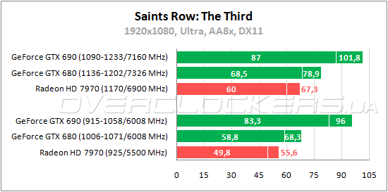 GeForce GTX 690 быстрее однопроцессорного товарища на 41% в Saints Row: The Third. Однако небольшой прирост при разгоне свидетельствует, что и в этой игре производительность потихоньку начинает упираться в возможности процессора.