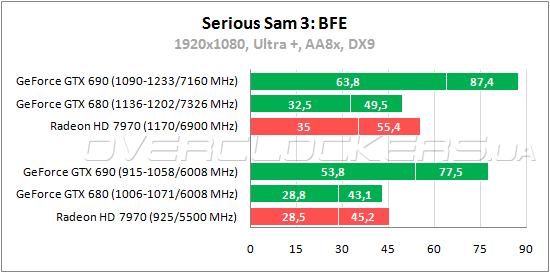 Хорошее масштабирование производительности показывает двухчиповый видеоадаптер в Serious Sam 3, обходя один GeForce GTX 680 на 80—87%. Разгон дает прирост на 19% по минимальному fps и 13% по среднеигровому показателю.
