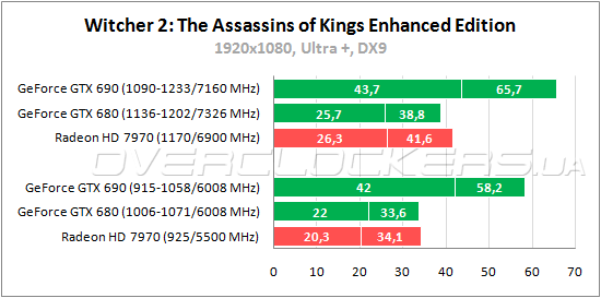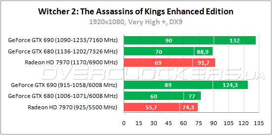У новых GeForce с технологией плавной регулировки частоты в зависимости от энергопотребления наибольшие просадки по частоте мы наблюдали в Hard Reset и втором «Ведьмаке». GeForce GTX 690 в первой игре работал в диапазоне 1019—1045 МГц, а во второй были просадки до 993 МГц.