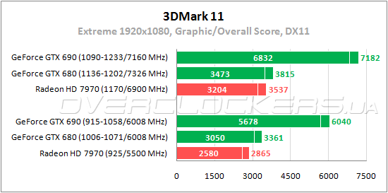В синтетике GeForce GTX 690 производительнее GeForce GTX 680 на 86%, а Radeon HD 7970 слабее в 2,2 раза. Разгон дает неожиданно высокий прирост в 20%.