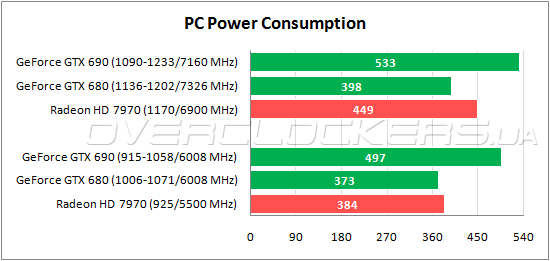 Вполне ожидаемо система с GeForce GTX 690 потребляет больше электроэнергии, чем с одночиповыми видеокартами. Но если сравнивать с разогнанными конкурентами, то разница не особо-то и существенная (особенно с Radeon HD 7970).