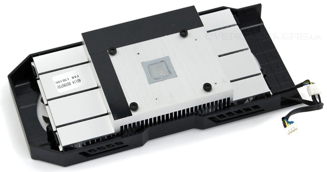 Система охлаждения полностью повторяет таковую у ASUS GTX650TI-1GD5. Цельная алюминиевая конструкция с широкими ребрами. Никаких тепловых трубок или медных оснований. Вместо термопрокладок для контакта с микросхемами памяти зона вокруг GPU накрыта диэлектрической пленкой.