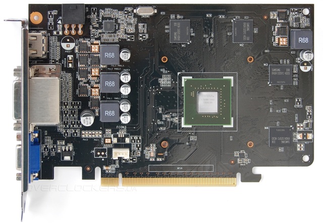 Объем памяти стандартный — два гигабайта, набран четырьмя микросхемами Samsung K5G41325FC-HC03. Точное такие же чипы используются у MSI N750Ti TF 2GD5/OC.