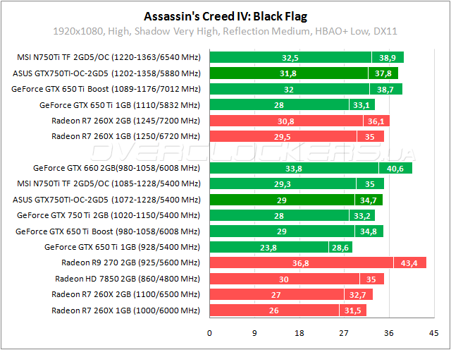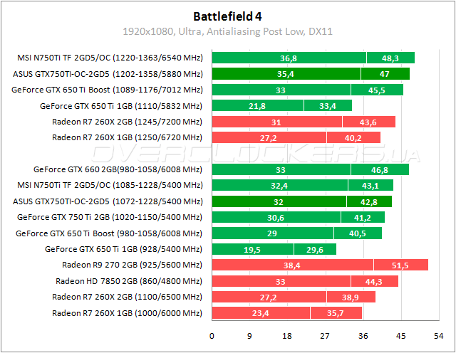 У ASUS идентичные результаты с GeForce GTX 650 Ti Boost в Black Flag. В разгоне MSI оказывается быстрее героя обзора на 3%.