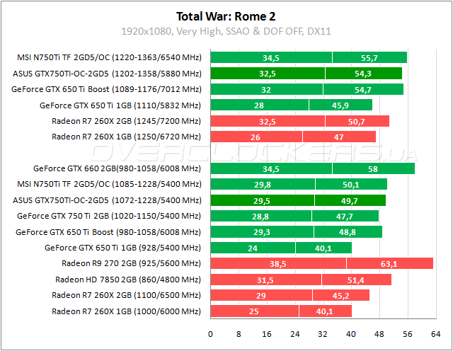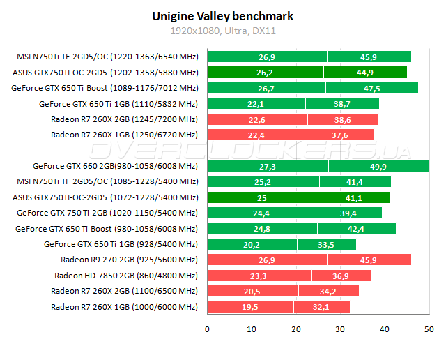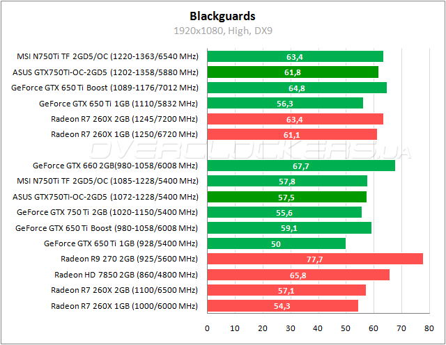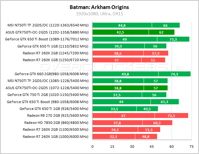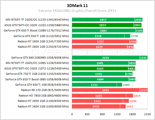 Чуть сдают позиции GeForce GTX 750 Ti. Тут даже отрыв от Radeon R7 260X очень скромный. В разгоне ASUS не дотягивает до уровня Radeon HD 7850.