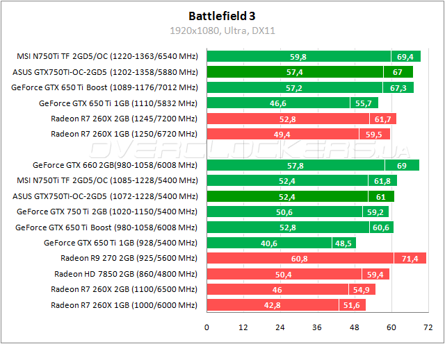 В Battlefield 3 мизерное отставание от собрата MSI. При разгоне эта разница доходит до 4%. ASUS даже при заводских частотах немного быстрее Radeon HD 7850, а повышение частот минимизирует отставание от GeForce GTX 660.