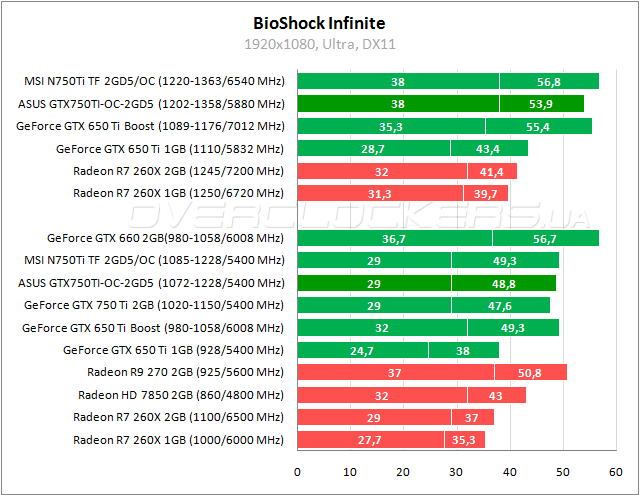Странная ситуация наблюдается в BioShock Infinite. Непропорционально резкий скачок минимального fps при повышении рабочих частот. При этом в номинале и в разгоне у обоих моделей GTX 750 Ti показатель идентичный. На начальных частотах у ASUS небольшая разница с Radeon R9 270, а разгон позволяет обойти GeForce GTX 660.