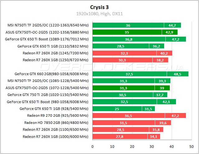 В Crysis 3 мы видим практически одинаковые результаты у ASUS и Radeon HD 7850 даже на заводских частотах. Прирост от разгона составляет 10–12%. GeForce GTX 660 в данной игре недостижим.