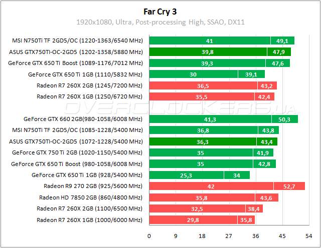 В Far Cry 3 наблюдается преимущество около 4% относительно референсного GeForce GTX 750 Ti и одинаковые показатели с Radeon HD 7850. Прирост от разгона — 10%.