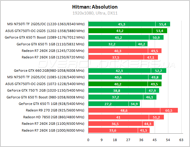 В Hitman преимущество над референсом 3–4%. Отставание от Radeon HD 7850 на уровне 2–3%. Разгон ускоряет ASUS еще на 7–8%.