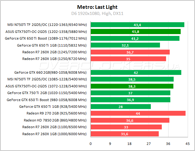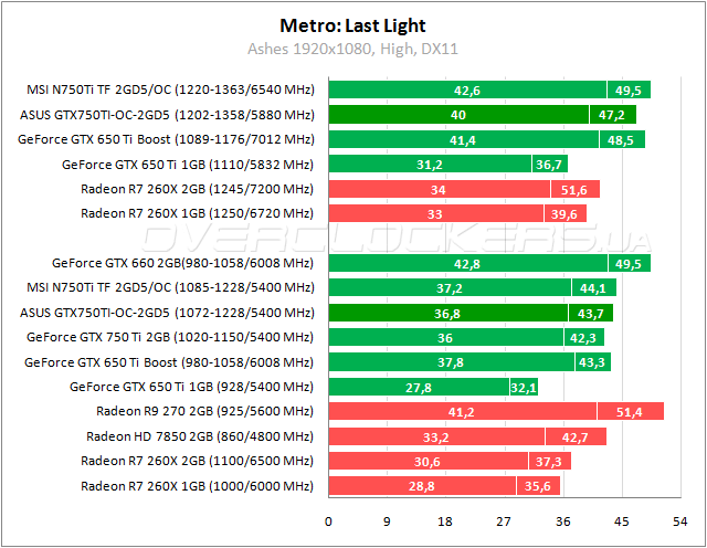 На уровне «Пепелище» в игре Metro: Last Light герой обзора изначально быстрее Radeon HD 7850, на одном уровне с GeForce GTX 650 Ti Boost. При разгоне разница между ASUS и MSI доходит до 5–7%.