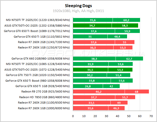У ASUS скромное отставание от GeForce GTX 650 Ti Boost в Sleeping Dogs. Radeon R7 260X лучше по минимальному fps, но слабее по среднему показателю. Разгон дополнительно ускоряет ASUS на 9–10%.