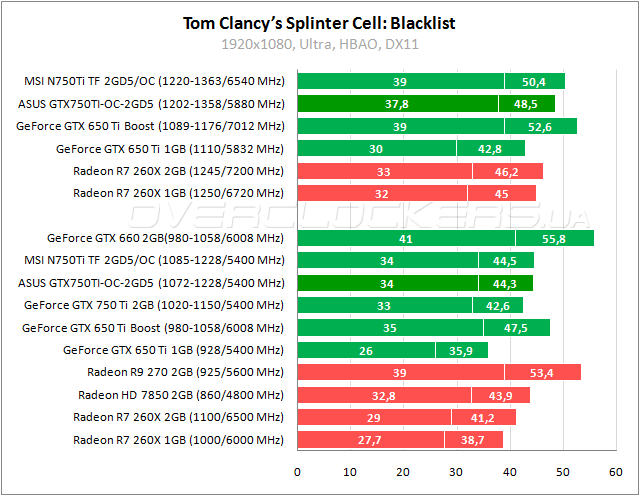 В Splinter Cell: Blacklist у ASUS преимущество 3% над референсом и 1–4% выигрыш относительно Radeon HD 7850. Прирост от разгона 9–11%.