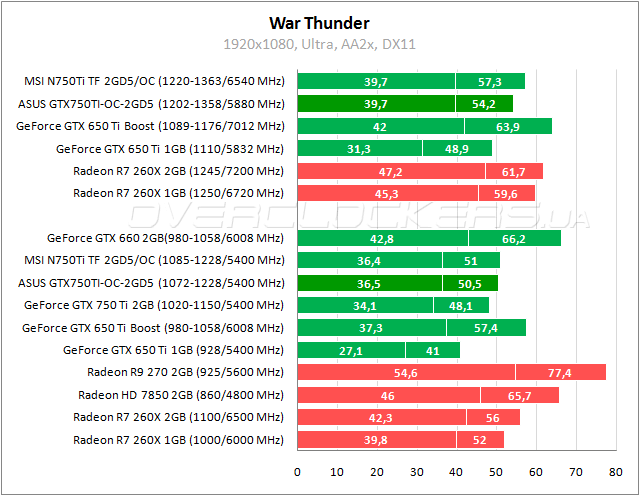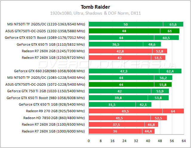 В Tomb Raider разница между ASUS и стандартным GeForce GTX 750 Ti на уровне 4–5%, отрыв от Radeon HD 7850 достигает 6%. Разгон позволяет выйти ASUS на уровень производительности GeForce GTX 660 и уменьшить отставание от Radeon R9 270 до 3–5%.