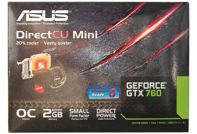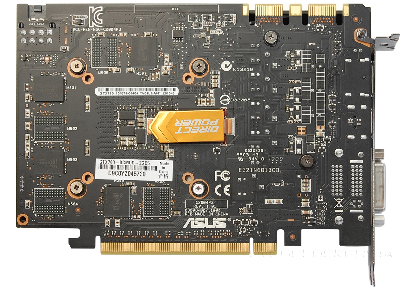 В дизайне печатной платы ожидаемо не произошло никаких изменений. Это копия ASUS GTX670-DCMOC-2GD5. Можно отметить только отсутствие трех конденсаторов в четырехфазной цепи питания графического процессора. По такому же дизайну выполнена и более крупная карта ASUS GTX760-DC2OC-2GD5, габариты которой обусловлены исключительно размерами системы охлаждения.