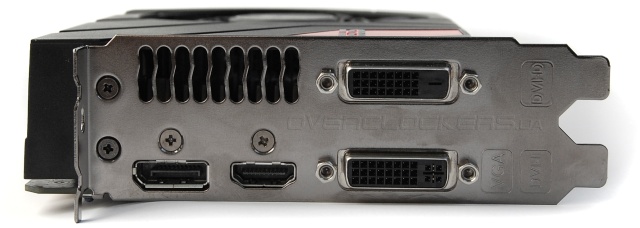 Горячий воздух от карты частично выдувается за пределы корпуса благодаря наличию вентиляционных отверстий на задней панели. Коммутационные возможности представлены стандартным для таких адаптеров набором из разъемов DisplayPort, HDMI и двух DVI
