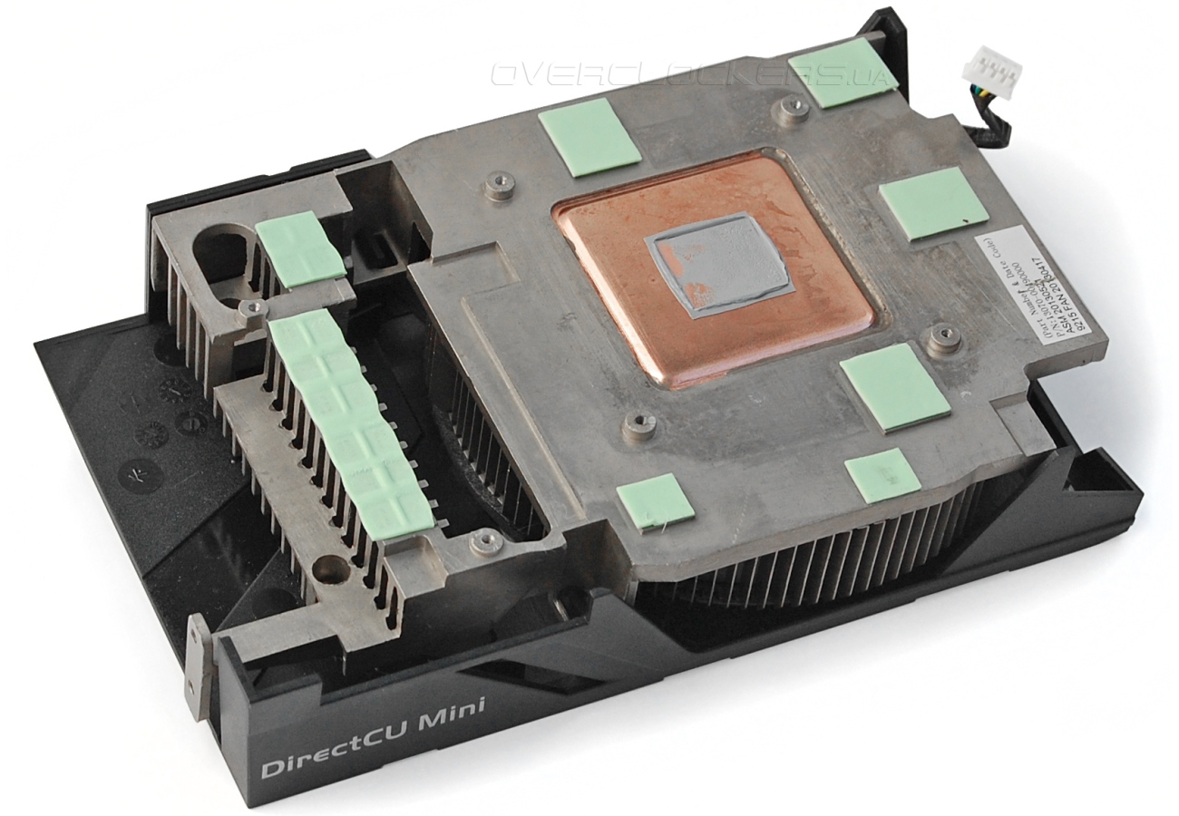 У ASUS единая система охлаждения для всех компонентов. Пластиковый кожух крепится на защелки и дополнительно фиксируется парой винтов. Отвод тепла от GPU осуществляется через медную площадку.