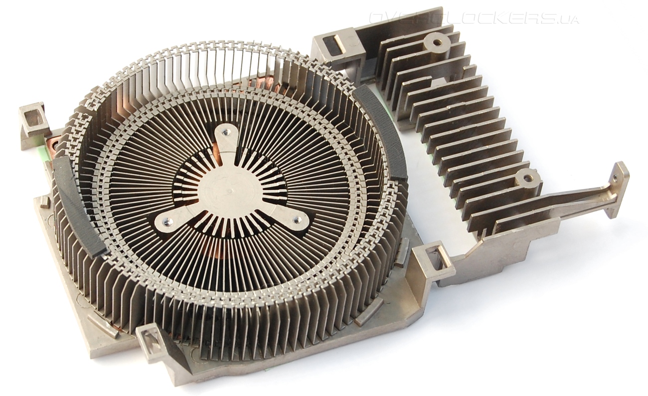 Медное основание является частью крупной испарительной камеры, работающей подобно тепловым трубкам. Испарительная камера зажата с одной стороны основанием, а с другой накрыта пластинчатым радиатором. Открыта лишь зона контакта с графическим чипом, которая выполнена в виде приподнятой площадки. Верхняя часть конструкции с расходящимися подобно лучам пластинами напоминает чашу, внутрь которой помещается вентилятор.