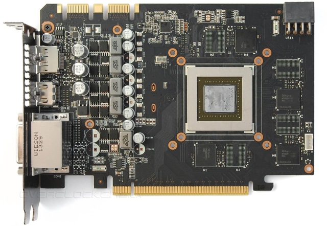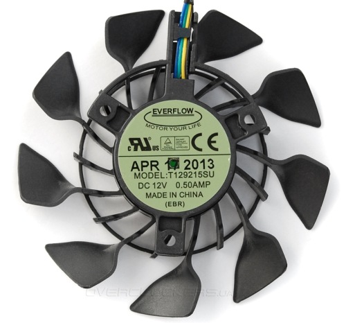 Короткая плата накрыта квадратным кожухом с небольшой красной вставкой. Используется знакомая фирменная система охлаждения с радиальным расположением ребер радиатора и особым вентилятором необычной формы.