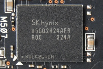 Два гигабайта памяти набраны восемью микросхемами SKhynix H5GQ2H24AFR R0C, которые распаяны с двух стороны платы.