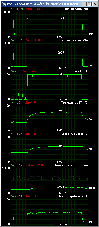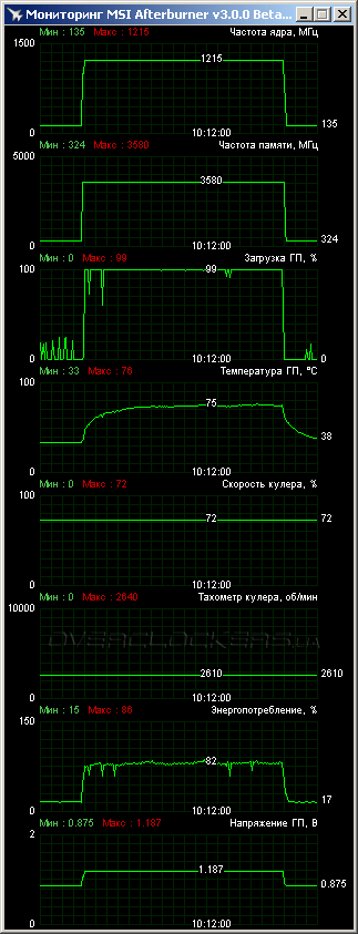 Для стабильности на частотах 1215/7160 МГц пришлось поднимать обороты вентиляторы до более высокого уровня.