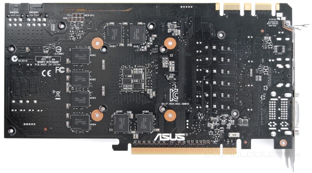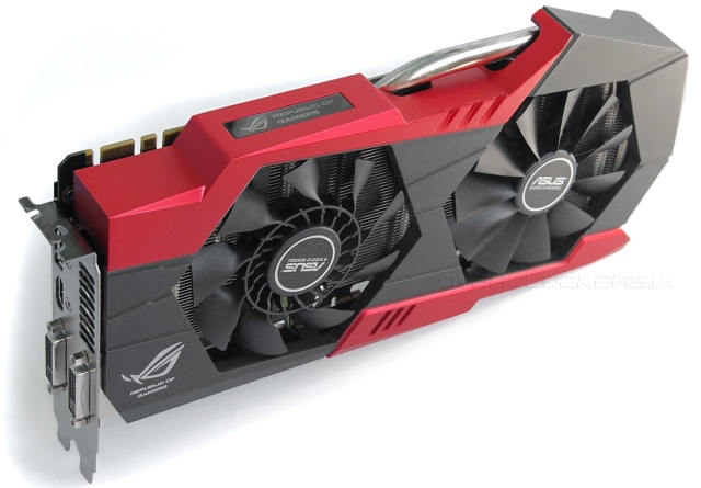 Сбоку есть окошко с логотипом и надписью Republic of Gamers, которое подсвечивается светодиодами разного света в зависимости от степени нагрузки. Такой элемент вы могли видеть на Matrix GTX 780 Ti Platinum.