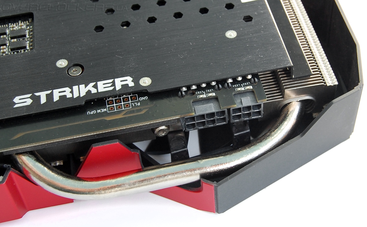 Разъемы питания развернуты защелками вверх для простоты подключения. Вместо стандартной конфигурации из двух шестиконтактных разъемов используется комбинация разъемов 8+6. В центре, в районе надписи Striker, на текстолите есть прозрачная подсвечиваемая красными светодиодами дорожка. Исключительно декоративный элемент, который присутствует и в некоторых системных платах ASUS.
