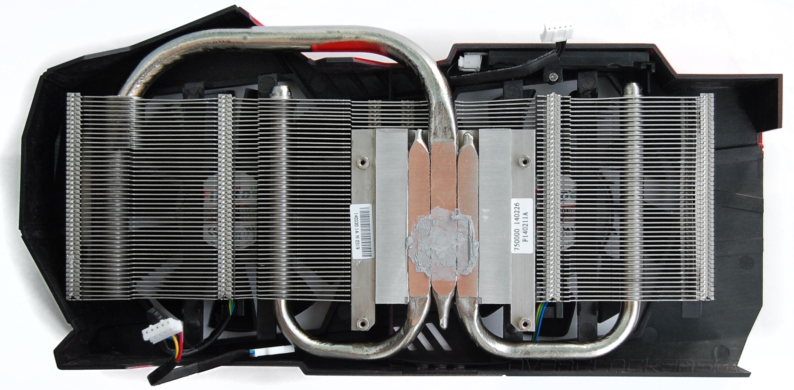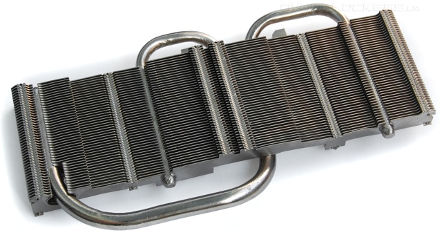 В основание уложено три тепловые трубки, которые напрямую контактируют с поверхностью кристалла GPU. Сами трубки очень крупные — центральная диаметром 10 мм, боковые по 8 мм.