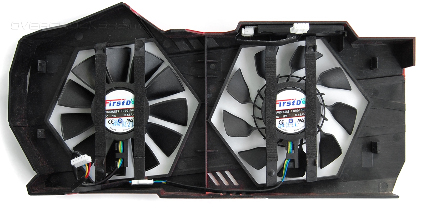 Вентиляторы крепятся прямо на кожух, который цепляется за ребра при помощи защелок. Под пластиковыми рамками вентиляторов есть мягкие прокладки, которые должны компенсировать возможную вибрацию.