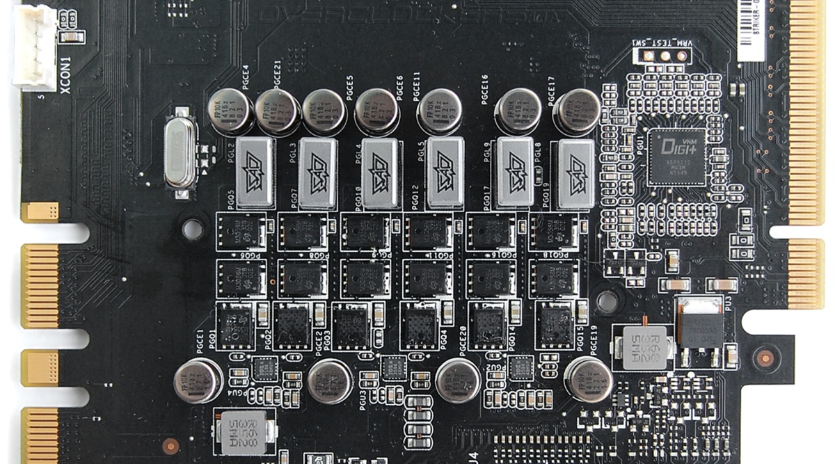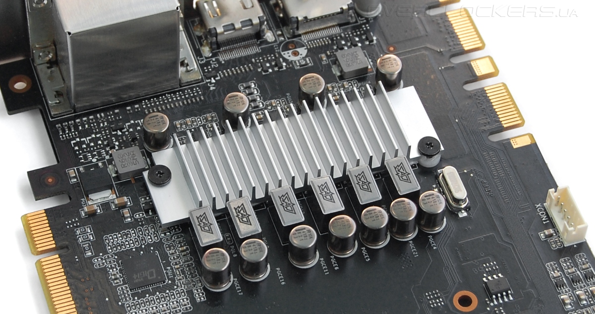 Преобразователь напряжения графического процессора включает шесть фаз под управлением контроллера Digi+ ASP1212. Память запитана от двух фаз. В ASUS GTX760-DC2OC-2GD5 была реализована схема 4+1.