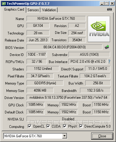 Базовая частота ядра повышена с 980 МГц до 1085 МГц при Boost Clock 1150 МГц. А вот память обошлась без ускорения и работает на эффективной частоте обмена данных в 6008 МГц, что соответствует стандартным спецификациям для GeForce GTX 760.