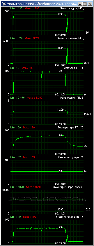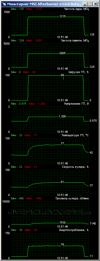 Стабильность в разгоне легко поддерживается при минимальном повышении скорости вентиляторов и столь же небольшом росте нагрева. Характеристики тестируемых видеокарт