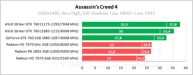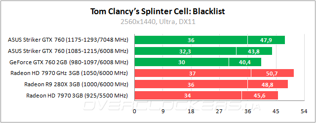 В Blacklist у ASUS преимущество над референсным GeForce GTX 760 на уровне 8% и отставание 4–5% от Radeon HD 7970. Повышение частот до 1175–1293/7048 МГц позволяет добиться мизерной разницы с Radeon R9 280X.