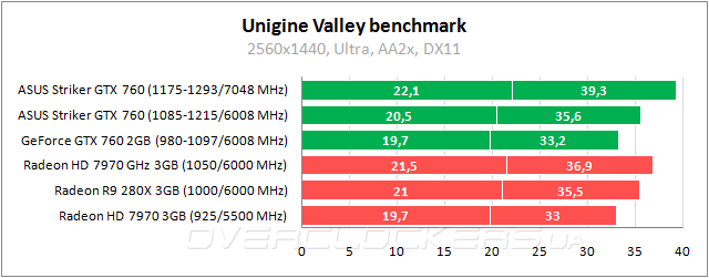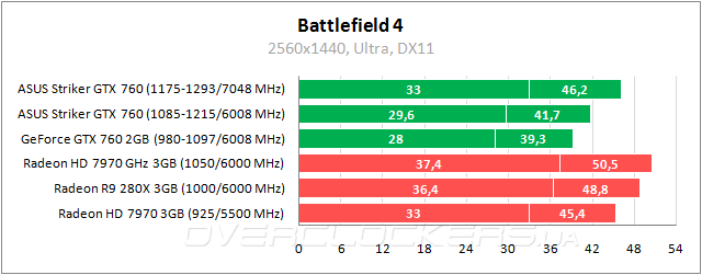 Примерно на одном уровне идут простые версии GeForce GTX 760 и Radeon HD 7970. ASUS в номинале близок к Radeon R9 280X, а при разгоне быстрее Radeon HD 7970 GHz Edition.
