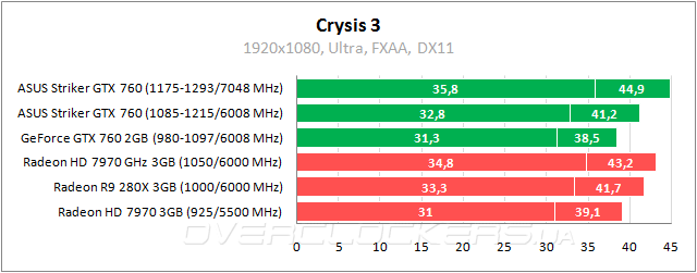 Очень близкие результаты у GeForce GTX 760 и Radeon HD 7970 в Crysis 3. Разогнанный ASUS производительнее Radeon HD 7970 GHz Edition.