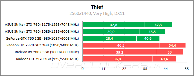 В Thief наш подопечный заметно уступает красной «команде». Даже разгон не позволяет сравняться с самым простым Radeon HD 7970.
