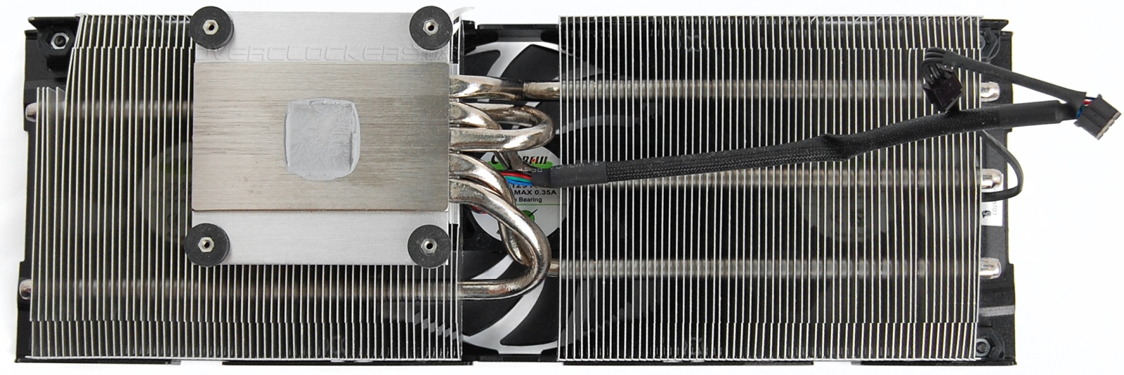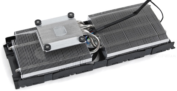 Пора поближе взглянуть на систему охлаждения. Перед нами большой двухсекционный радиатор с пятью тепловым трубками. Медное основание и трубки имеют защитное покрытие.