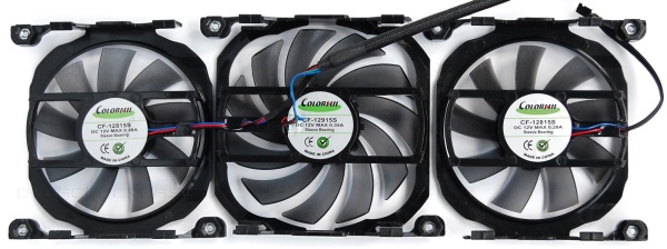 Вентиляторов три. Боковые Colorful CF-12815S типоразмера 80 мм, центральный — Colorful CF-12915S на 92 мм. Реальный размер лопастей чуть меньше. Форма самих лопастей у вентиляторов тоже отличается.