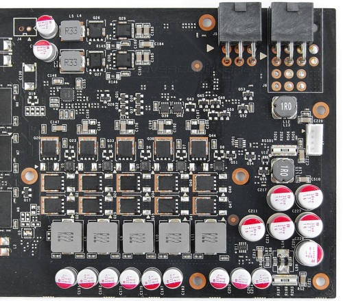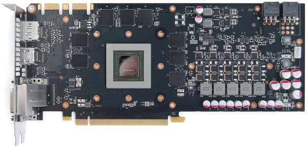 В итоге имеем пятифазное питание графического контроллера и двухфазное — памяти GDDR5. Напряжение подводится двумя шестиконтактными разъемами питания.