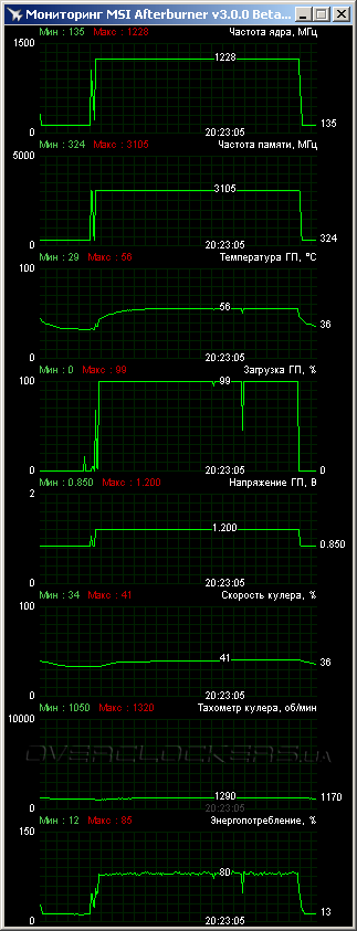 По итогам 12-минутной нагрузки Crysis: Warhead температура графического процессора не превысила 56 °C при 25 °C. Unigine Valley benchmark прогрел карту до 59 °C. Скорость вращения вентиляторов не превышала 1350 об/мин.